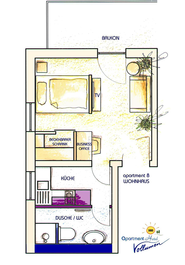 Dieses Apartment befindet sich, ruhig gelegen in der 1. Etage unseres Gästehauses mit einem grossen Balkon und Blick ins Grüne. Wer sich entspannen und erholen möchte, ist hier goldrichtig. Ein bequemes Bett 1.60 x 2.00 das auch gut Platz für 2 Personen bietet. Der große Balkon läd zum abendlichen Gläschen Bier oder Wein mit Blick in den Sonnenuntergang ein.